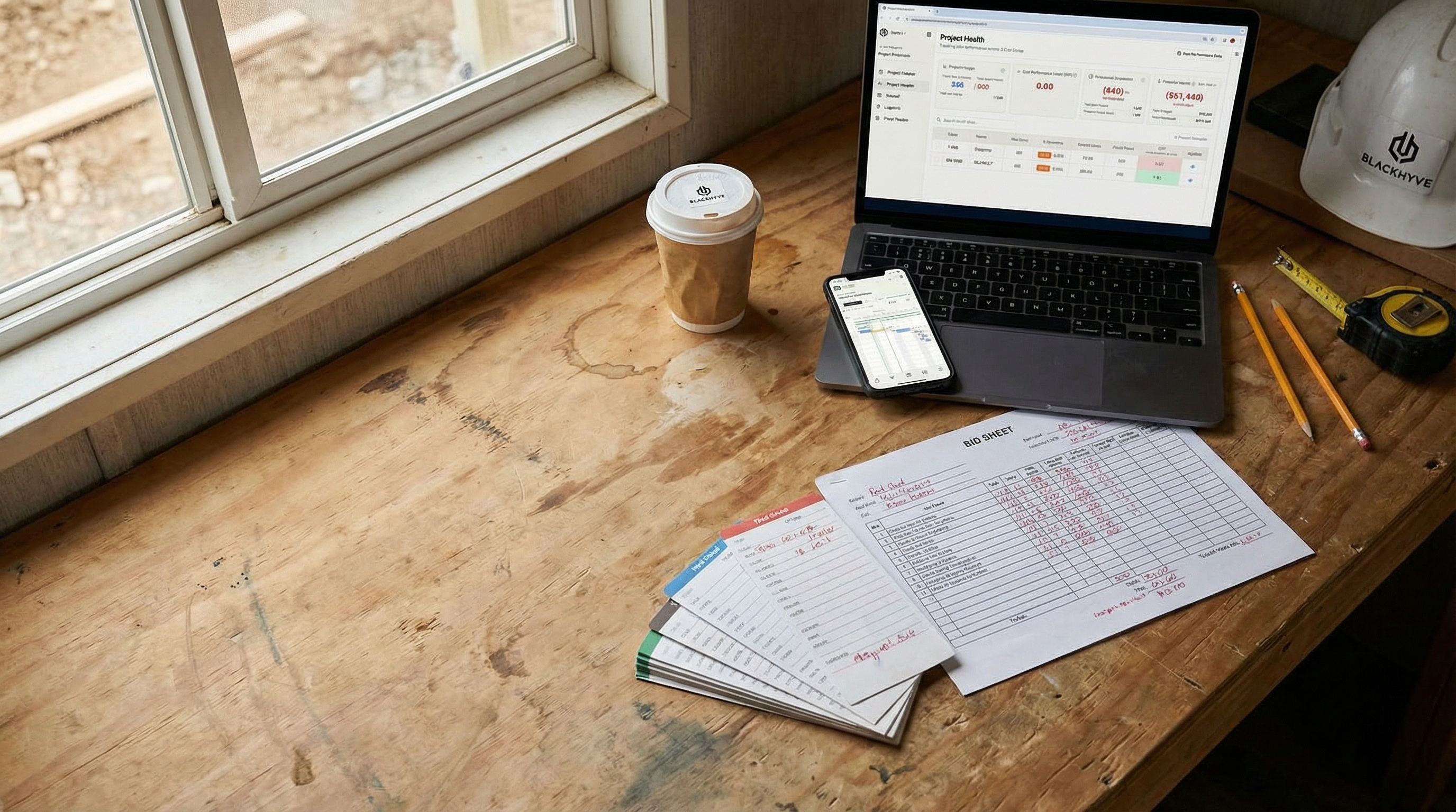 BlackHyve connects the data you're already collecting. Your estimate, your time cards, your field captures—all in one place. So you know where you stand. Every day.
